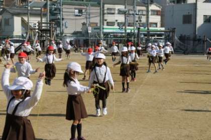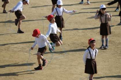 今年度から、子ども達の体力向上の取り組みの一つとして、全校なわとび運動を始めました。今週は、低学年の子ども達が、15分休憩に運動場に出てなわとび運動をがんばっています。まえとび、うしろとび、けんけんとびなどをしています。2分、3分と続けてとんでいると体中があったかくなります。