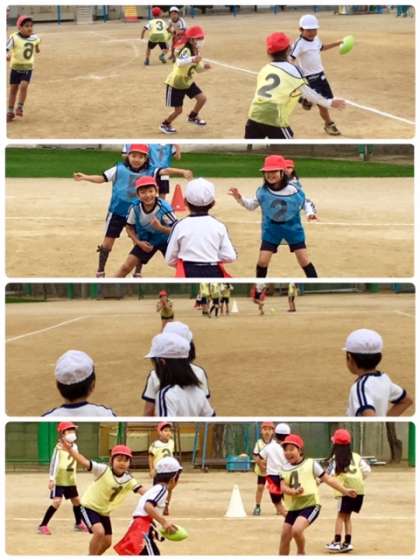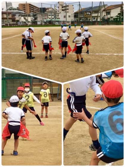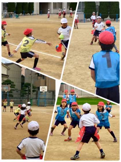 5時間目、運動場で2年2組がタグラグビーの導入をしていました。元気いっぱいです。