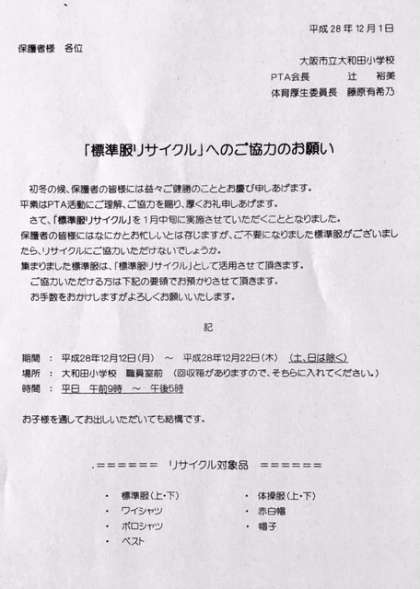 PTAでは、1月中旬に「標準服リサイクル」を実施します。