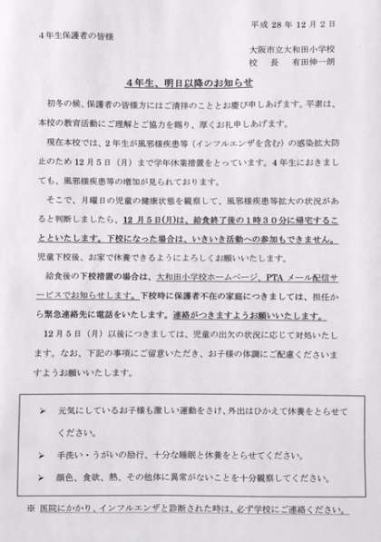 4年生におきましても風邪様疾患等(インフルエンザを含む)の拡大が心配されます。