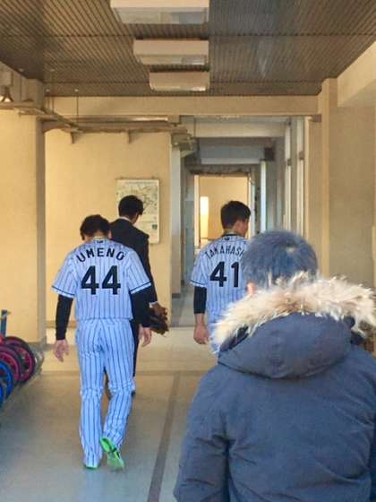 阪神タイガース出前授業を終えて高橋投手、梅野捕手が控え室に帰られました。