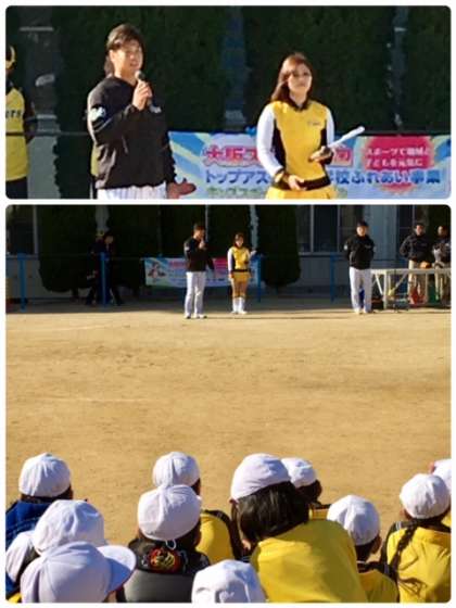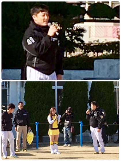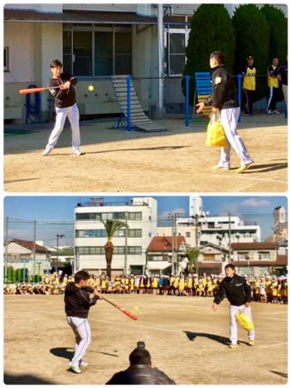 i続いて、梅野選手のバッテイング実演です。柔らかいおもちゃのようなボールですが、高橋投手のトスを、軽々運動場の対角まで運びました。