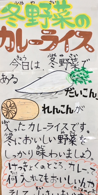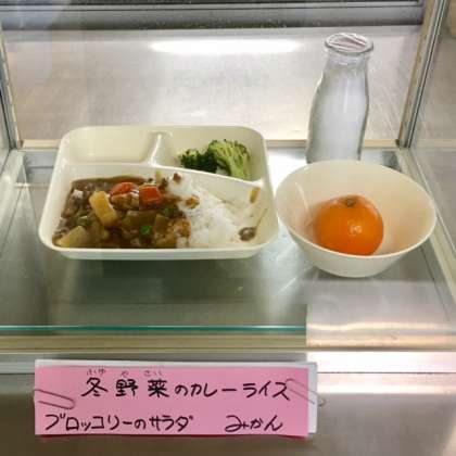 今日の献立は、冬野菜のカレーライス、ブロッコリーのサラダ、みかん、牛乳です。
