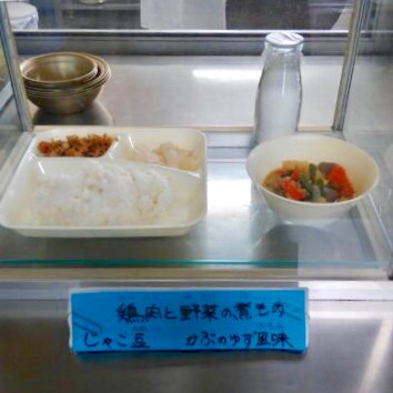 今日の献立は、鶏肉と野菜の煮物、かぶらの柚子風味、じゃこ豆、ご飯、牛乳です。