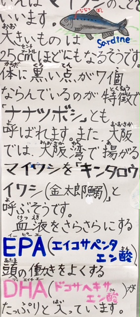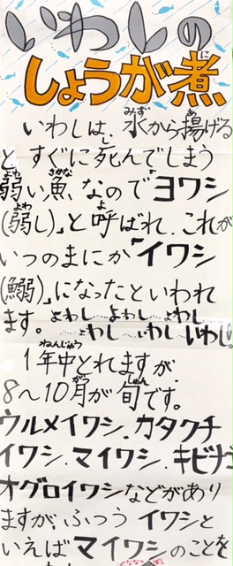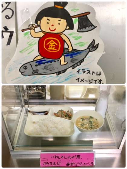 今日の献立は、イワシの生姜煮、高野豆腐の炒り煮、かき玉汁、ご飯、牛乳です。