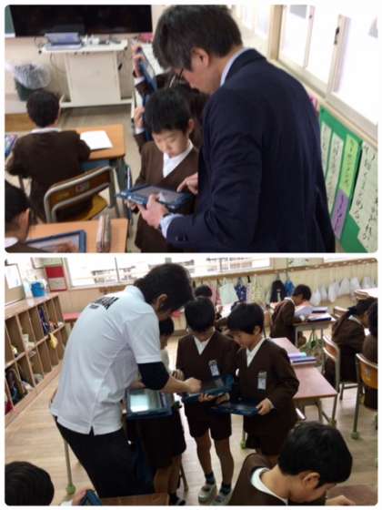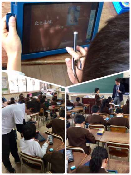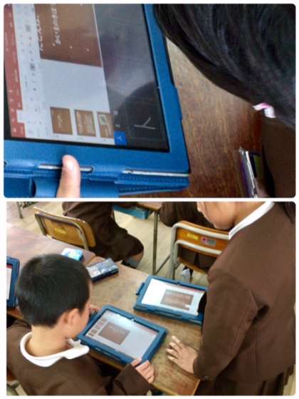 3年1組の国語です。教科書で学習したことがらを西淀川図書館から借りた図書を参考にして調べ学習した結果を、タブレットパソコンでプレゼンを作っています。