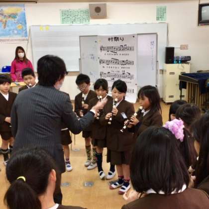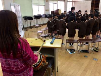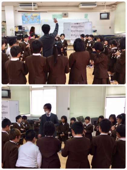 3年2組の音楽の授業です。担任の依田先生と教務主任の三好先生が音楽づくりの学習をしています。