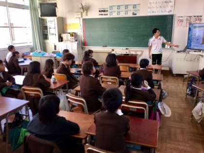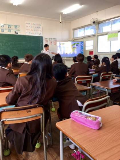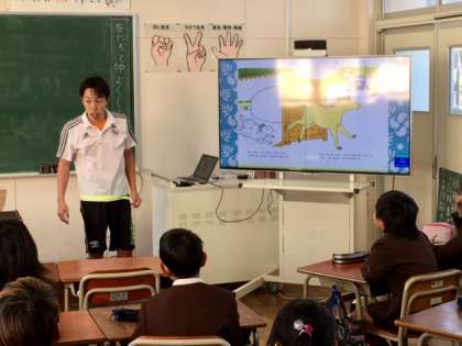 4年1組の読書タイムです。「てんとう虫さん」が推薦図書を紹介してくださっていましたが、今日は石倉先生推薦の十二支の絵本を大型ディスプレイに映してお話ししてくださっています。子どもたちも集中しています。