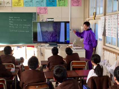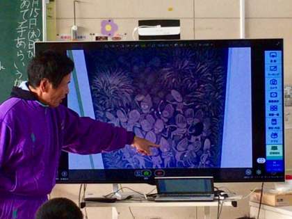 5年1組の読書タイムです。担任の大西先生が書画カメラで挿絵を大写しして読み聞かせをしてくださっています。大きく映すことで、教室の隅々まで、絵本の細かい表現が確認できます。大西先生と子どもたちは話を聞くだけでなく、画面でストーリーを確認しながら楽しんでいます。