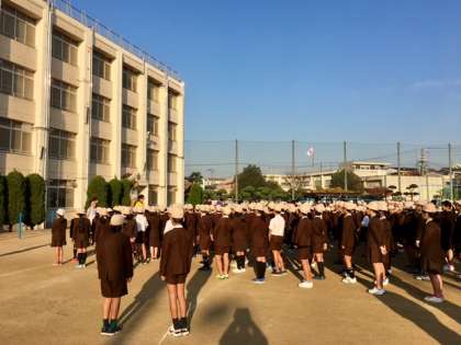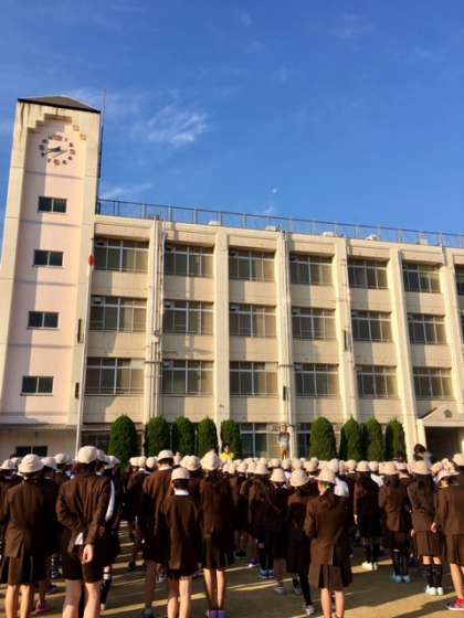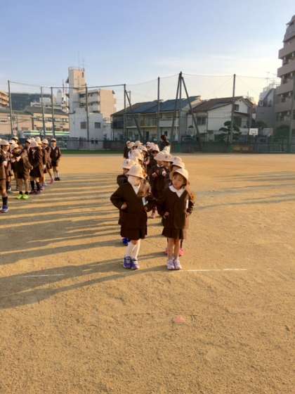おはようございます。月曜日の朝は児童朝会です。児童朝会もいよいよ二学期最後となりました。今朝の整列終了一番は、1年1組のみなさんです。立派です。