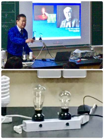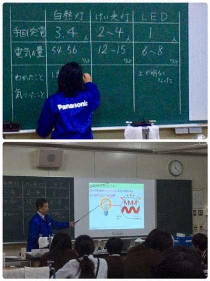 三つ目の実験は、それぞれの光源を、班全員のダイナモ発電機で発光させて明るさを確かめました。また、点灯までの時間も観察しました。黒板にまとめて考えました。