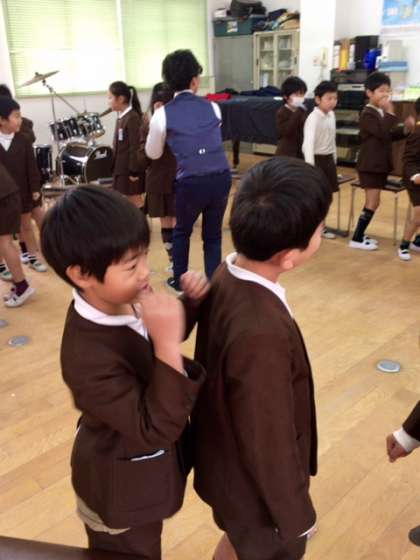 2人ひと組になって、「村祭」の旋律に合わせて「お囃子のリズムで肩たたき」をします。子どもたちの表情からも実に楽しそうです。