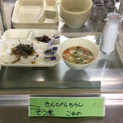 今日の献立は、きんぴらちらし、ごまめ、ごはん、お雑煮、牛乳です。