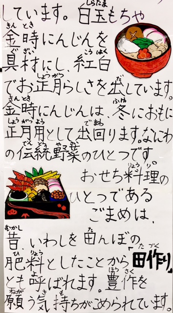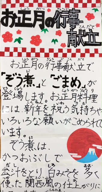 今日の給食は行事食、お正月料理が提供されます。最近のおせち料理はずいぶん洋風化して華やかになって来ましたが、やっぱりお正月料理といえば、お雑煮ですね。我が家でもお餅を幾つ食べるか賑やかな様子が、毎年繰り広げられています。みなさんのご家庭ではいかがでしょうか。