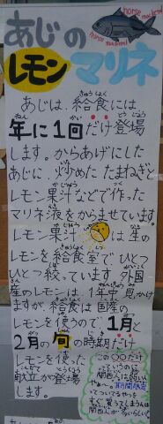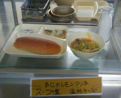 今日の給食は、あじのレモンマリネ、スープ煮、固形チーズ、ライ麦パン、牛乳です。