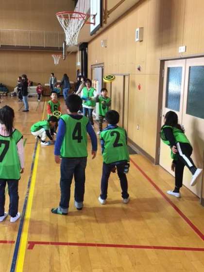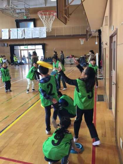 ゲームを待っているチームは、フリスビーでキャッチボールをしています。