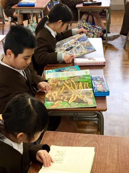 1組は自読に取り組んでいます。学級文庫には、子どもたちが興味を示しそうな本がたくさん配架されています。低学年の子どもたちは大きな本や、カラフルな本が人気のようです。