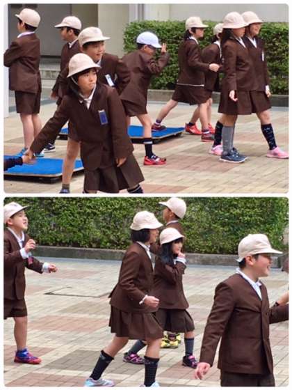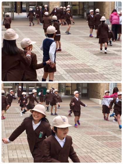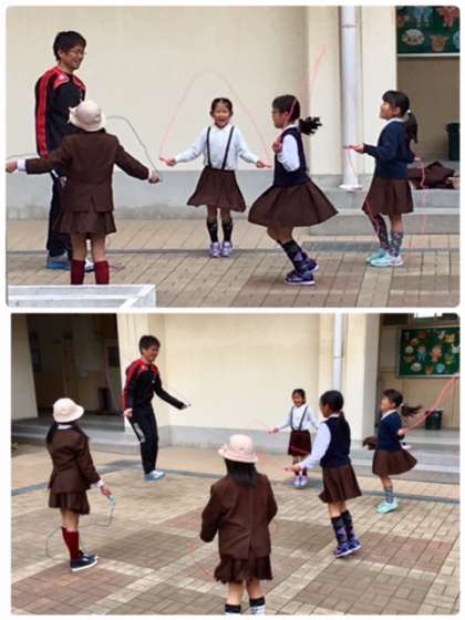 中庭では、ダルマさんが転んだや、なわとびに興じています。子どもは風の子!