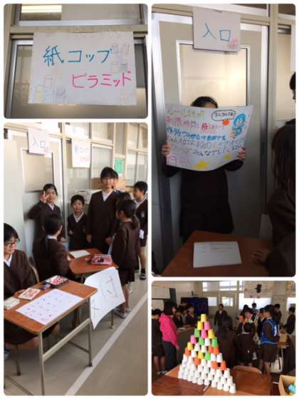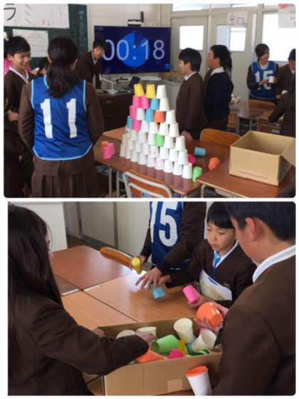 6年1組は「紙コップピラミッド」をしてくれました。難しいのにすごく高く積み上がっていました。