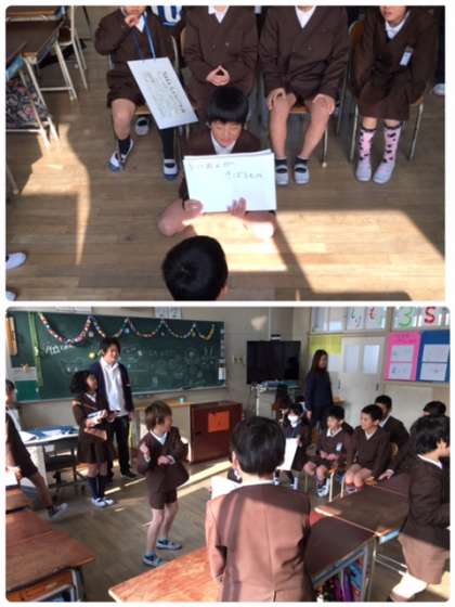 3年2組は「班で仲良くジェスチャーゲーム」をしてくれていました。演技をする子どもも、推理する子どもも楽しそうです。