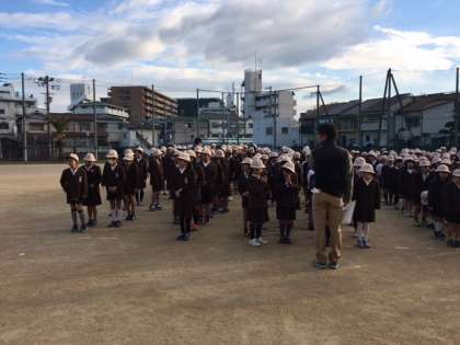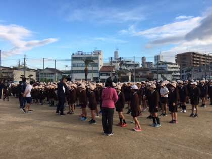 寒さに負けず、今朝は運動場で児童朝会です。