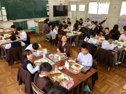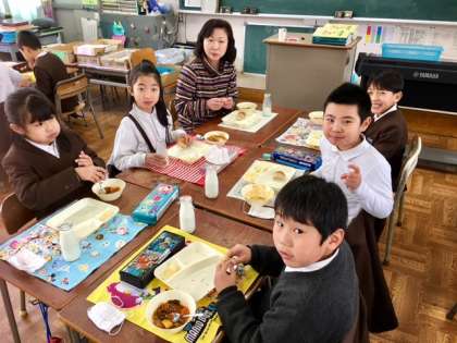 今週は「給食週間」です。給食週間では、学級担任の先生以外の教職員が教室に招かれて、子どもたちと一緒に給食を食べます。