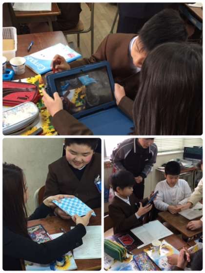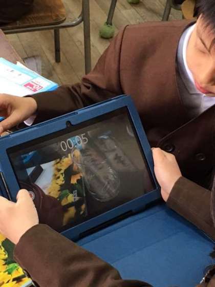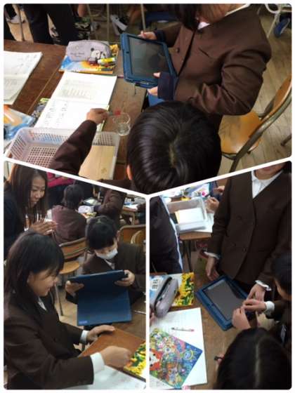 実験結果をタブレットパソコンで撮影して、クラスのみんなに見せる素材を撮影しています。