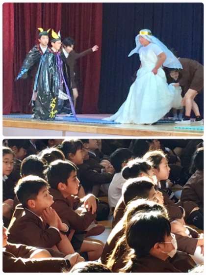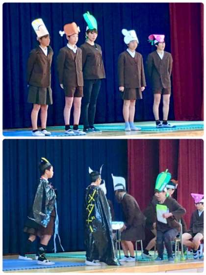 給食委員会の発表は、演劇仕立での発表です。食事が健康にとても大切なこと、バランス良く食べることの大切さをお芝居にしてくれていました。大切にしないと「メタボ」になる、食事だけでなく、睡眠や規則正しい生活が必要だと観せてくれました。とても楽しく、面白い中で健康に大切な食事について教えてくれました。