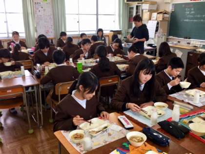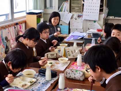 3年1組は給食調理員の北川さん、3年2組は給食調理員の川口さん、6年1組は小山教頭先生、6年2組は田中祥子先生、6年3組は校長先生が子どもたちと給食をいただきます。