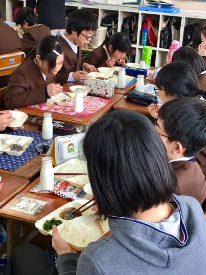 子どもたちは田中祥子先生に色々な話をしてくれました。一緒に食べていた子どもは「パンよりご飯が好き、ご飯の時は時間内に食べ終わる。」や、「卒業遠足で、キッザニア甲子園に行くのが楽しみ、5時間目に班決めをするのがワクワクする。」など、話してくれました。