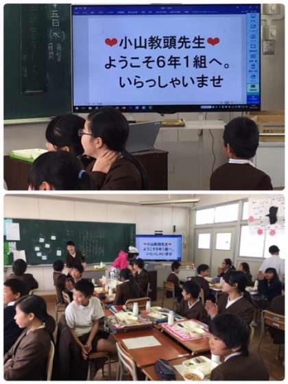 3年1組は給食調理員の北川さん、3年2組は給食調理員の川口さん、6年1組は小山教頭先生、6年2組は田中祥子先生、6年3組は校長先生が子どもたちと給食をいただきます。