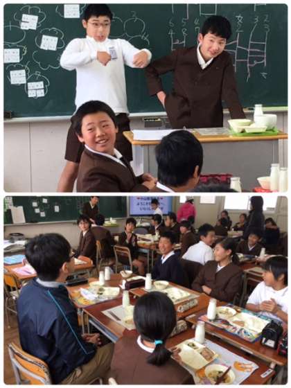 小山教頭先生が教室に入るや否や、熱烈歓迎の拍手が鳴り止みません。いただきますの係の児童も、クラスの子どもたちも大きな声で「いただきます!」と楽しい時間を過ごしました。