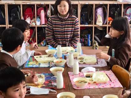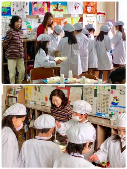 3年1組は給食調理員の北川さん、3年2組は給食調理員の川口さん、6年1組は小山教頭先生、6年2組は田中祥子先生、6年3組は校長先生が子どもたちと給食をいただきます。