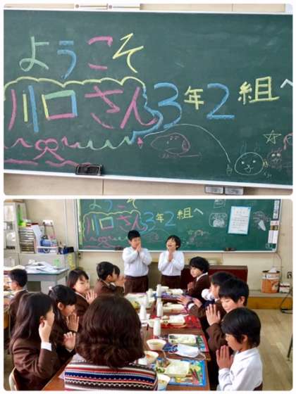 教室の黒板には歓迎の文字が書かれて、給食前から盛り上がっていました。いただきますの後は、子どもたちが歓迎の催しをしてくれました。ありがとう!
