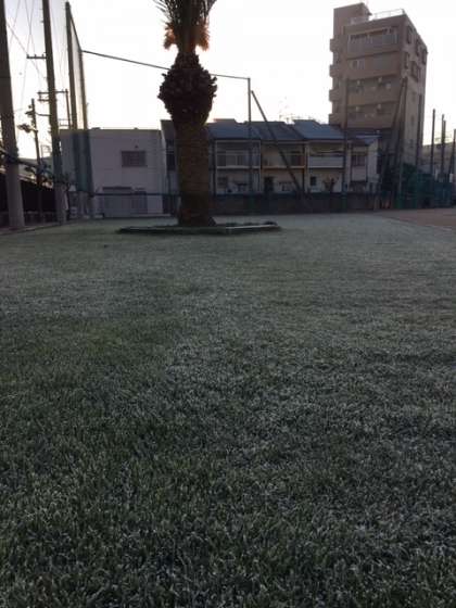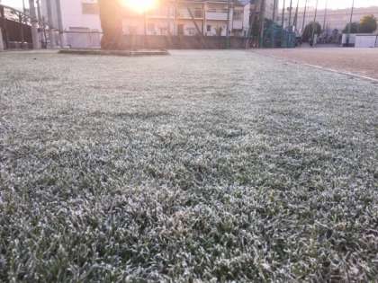 おはようございます。底冷えのする朝です。芝生広場も真っ白な霜で覆われています。