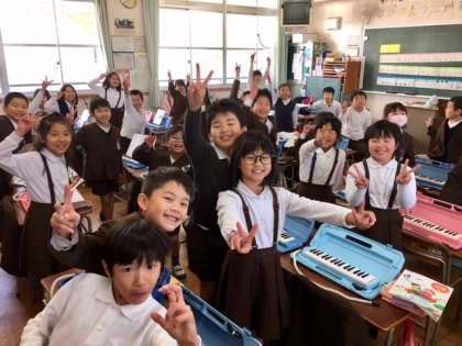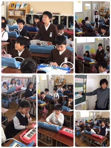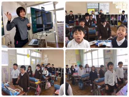 4時間目に教室に行くと、大歓迎を受けました。歌声は高らかに、鍵盤ハーモニカは軽やかに、三部に分かれて遠足してくれました。