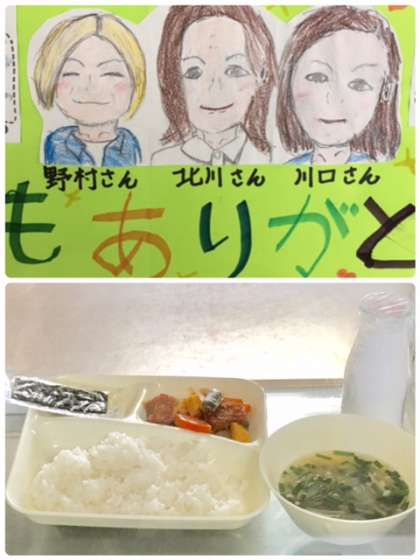 昨日、なかよし集会で子どもたちから給食調理員さんにお礼のメッセージが送られました。その、メッセージを給食室に掲示してくだっていたので、あわせて紹介します。