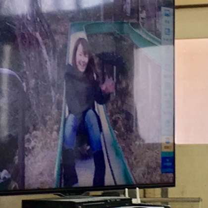 この、外国語活動の研究授業はCLIL算数の内容で進めます。大画面テレビには、様々な滑り台が示されました。福間先生も滑り台を滑って来ました。お気に入りの滑り台を選び、なぜその滑り台を選んだか?を考えます。