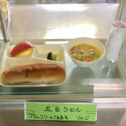今日の献立は、五目うどん、ブロッコリーの胡麻和え、レーズン、牛乳です。