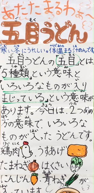 天気予報では、次第に暖かくなってくるはずなんですが、冷たいですね。そんな冷たい日には「温かいおうどんが食べたい!」ですね。今週最後のきゅは「五目うどん」です。