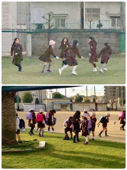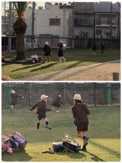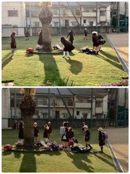 今朝も元気に子どもたちが登校して来ました。おやおや?今日は芝生広場に集まって来ました。ランドセルをフェニックスの下に投げ出して、とても楽しそうに追っかけっこをしています。チャイムの音とともに校舎に戻って行きました。