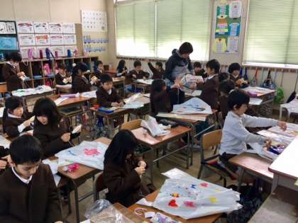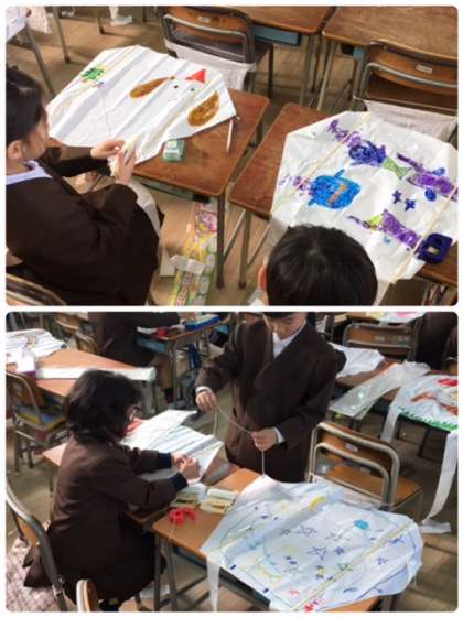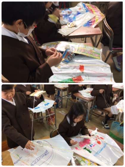 1年1組は図工の時間です。思い思いの凧を作っています。早く仕上げた子どもは、困っている友だちに教えています。