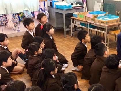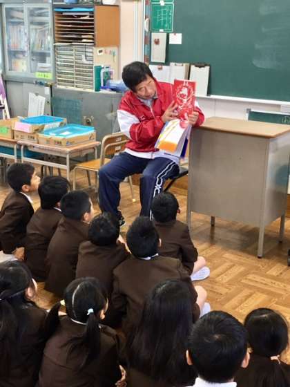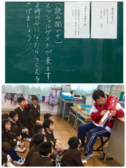 2年1組の読書タイムです。今日はスペシャルゲスト5年生担任の大西先生が読み聞かせをしてくださっています。