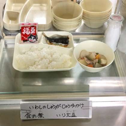 今日の献立は、イワシの生姜醤油掛け、含め煮、煎り大豆、ごはん、牛乳です。