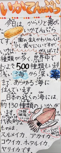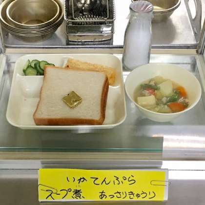 今日の献立は、イカ天ぷら、あっさりキュウリ、スープ煮、食パン、バター、牛乳です。