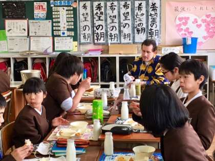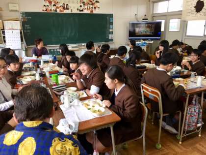 給食の時間、6年2組にMATT先生が来てくださいました。子どもたちとランチタイムです。ふと、教室のディスプレイを見ると「能」のビデオが再生されています。