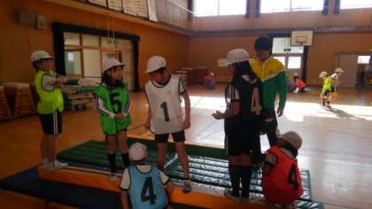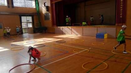 体ほぐしの運動をした後、今まで作ってきた運動の場を使ってみんなで楽しんで運動しています。