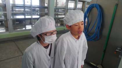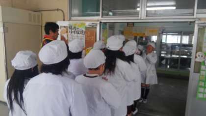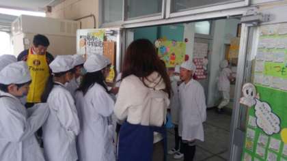 外はだいぶ冷え込みます。子どもたちは寒さに負けずに、給食室前で給食の順番を待っています。