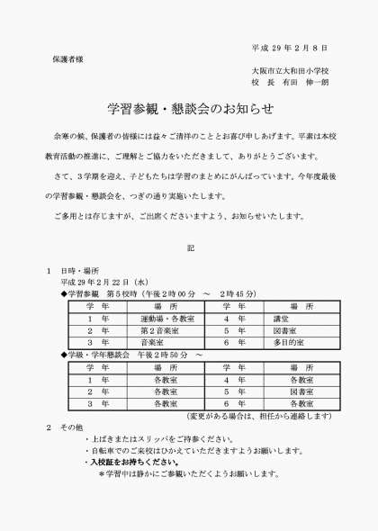 本日、「学習参観・懇談会のお知らせ」の文書をお子様を通じて保護者の皆様に配付いたします。案内のお手紙は学年ごとに発行しています。参観・懇談会にどうぞお越しください。