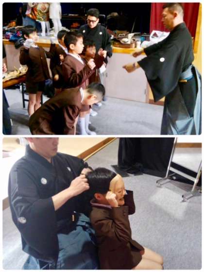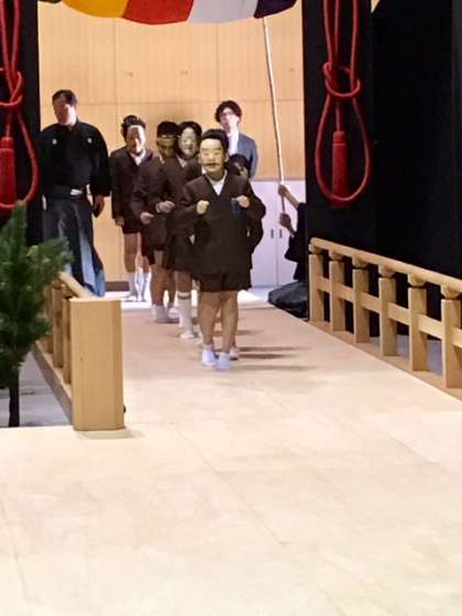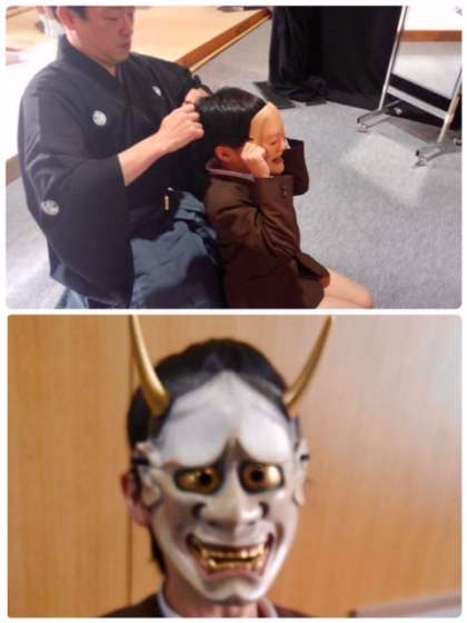 能面のお話を聞いているあいだに、舞台裏では、各学年の代表児童が能面をつけていただいています。